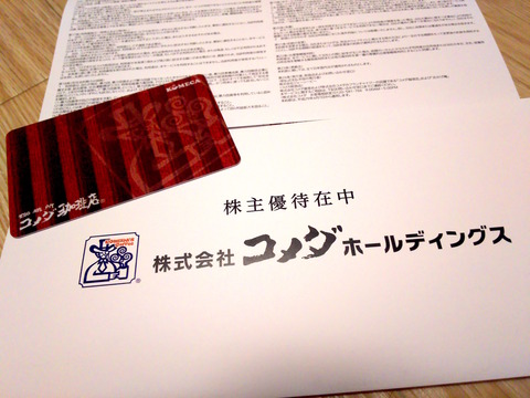 コメダ珈琲の株主優待は1000円相当の電子マネー自社商品詰め合わせ 自社商品詰め合わせを楽しみに楽しみに、今日やっと議決権のお知らせが来たのだけど、なんと次回から自社商品詰め合わせはなしで電子マネーのみに・・ 4月にお知らせが出ていたのを見逃してました・・ステックコーヒーがもらえるのは2017円2月の権利確定時で最後でした。次回からの優待内容は、プリペイドカード「KOMECA」に1000円がチャージされるというもの。カードが送られてきた笑 ちなみに、今回から議決権の行使で500円もチャージされます。より多くの株主の意見を求めているようでこの辺は好感とはいえ、近くにあまりコメダがないのでできれば自社商品詰め合わせがよかったなぁ・・ コメダ珈琲 オリジナル スティックコーヒー 3杯分 ミルク砂糖入り 新品価格¥598から (2017/5/14 22:59時点) よく店舗に行く人には、年に2回権利確定月があるのでおすすめです!今日注目の株式投資ツイッターアカウント アクセス数ランキングTOP10